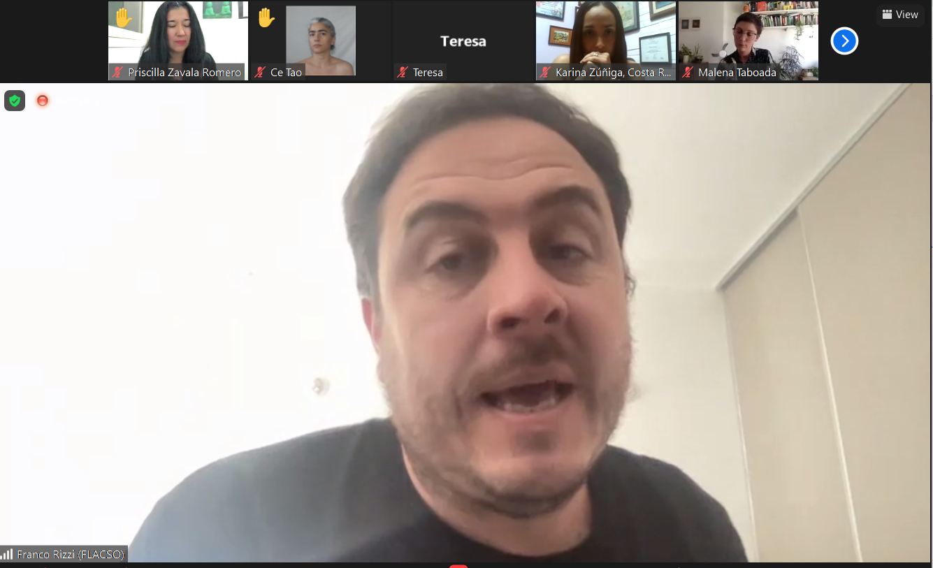 O encontro desta quinta-feira começou com Franco Rizzi, coordenador acadêmico do curso de pós-graduação (junto com Belén Igarzábal), lembrando que este curso surgiu de um trabalho conjunto após uma pesquisa do IberCultura Viva realizada em 2017. “Buscamos espaços específicos para formação em políticas culturais comunitárias e não encontramos nada na América Latina. Havia espaços de formação dos governos, mas não de qualquer universidade ou centro de formação acadêmica. Com base nisso, este curso foi construído. Hoje temos mais de 500 pessoas formadas em toda a região, e a cada ano que renovamos muitas pessoas ingressam, o que mostra que há uma demanda real no setor e uma movimentação de pessoas muito interessante”, disse.