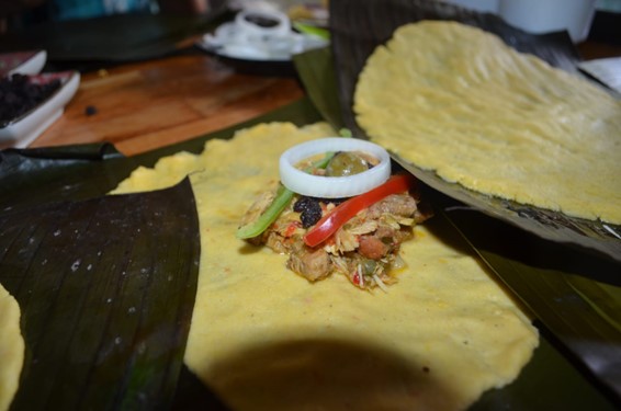 “Como na Guatemala, adiciona-se água morna e sal à farinha de milho até virar ‘chicle’ ou chirle, ervas aromáticas, queijos e também molhos de tomate vermelho e pimentas secas. Quem quiser completo acrescenta feijão ou carne. Em seguida, é embrulhado na mesma tuza ou chala de onde foi retirado, e um fogo é aceso como oferenda aos deuses maias, para ser fervido.”