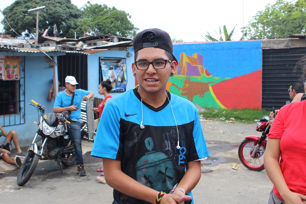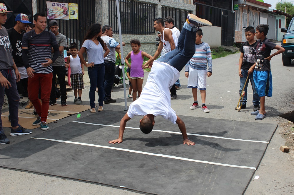 A visita terminou com um baile urbano na rua, com os jovens da Asociación Cultura y Arte Urbana (ACAU). “Começamos com umas cartolinas na rua, há um ano e meio”, contou Cynthia Avilés Saenz, 19 anos, uma das criadoras do projeto “Empoderando-nos das esquinas”. “Nos colocávamos para dançar na rua, as pessoas gostavam, então surgiu a ideia de ter um projeto para intervir nas principais esquinas da comunidade. Eram uns cinco garotos, agora são 20, 30 meninos e meninas aprendendo as disciplinas urbanas, o rap, o breaking, o “popping”, o grafite… As pessoas se aproximam, elas gostam muito.”