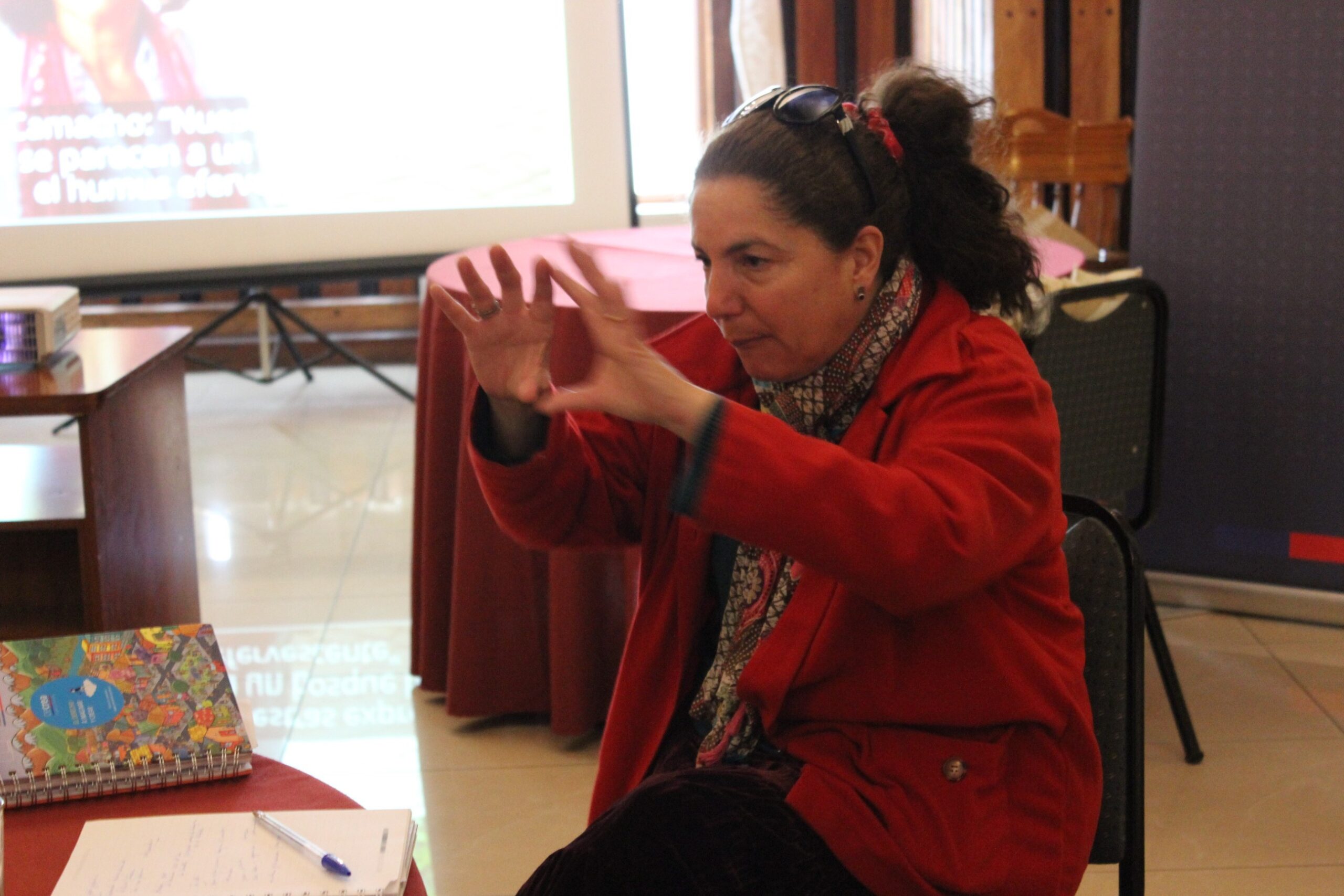 La mañana empezó con Camila Garrido hablando de los cuatro componentes relevantes que ellos como región tienen que ejecutar, en especial el de Residencias de Arte Colaborativo. Hace dos años Red Cultura implementa las residencias con el fin de llevar acceso a experiencias artísticas a los territorios (“no que la comunidad viera la experiencia artística, sino que la viviera”).