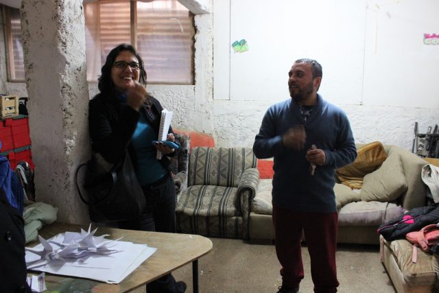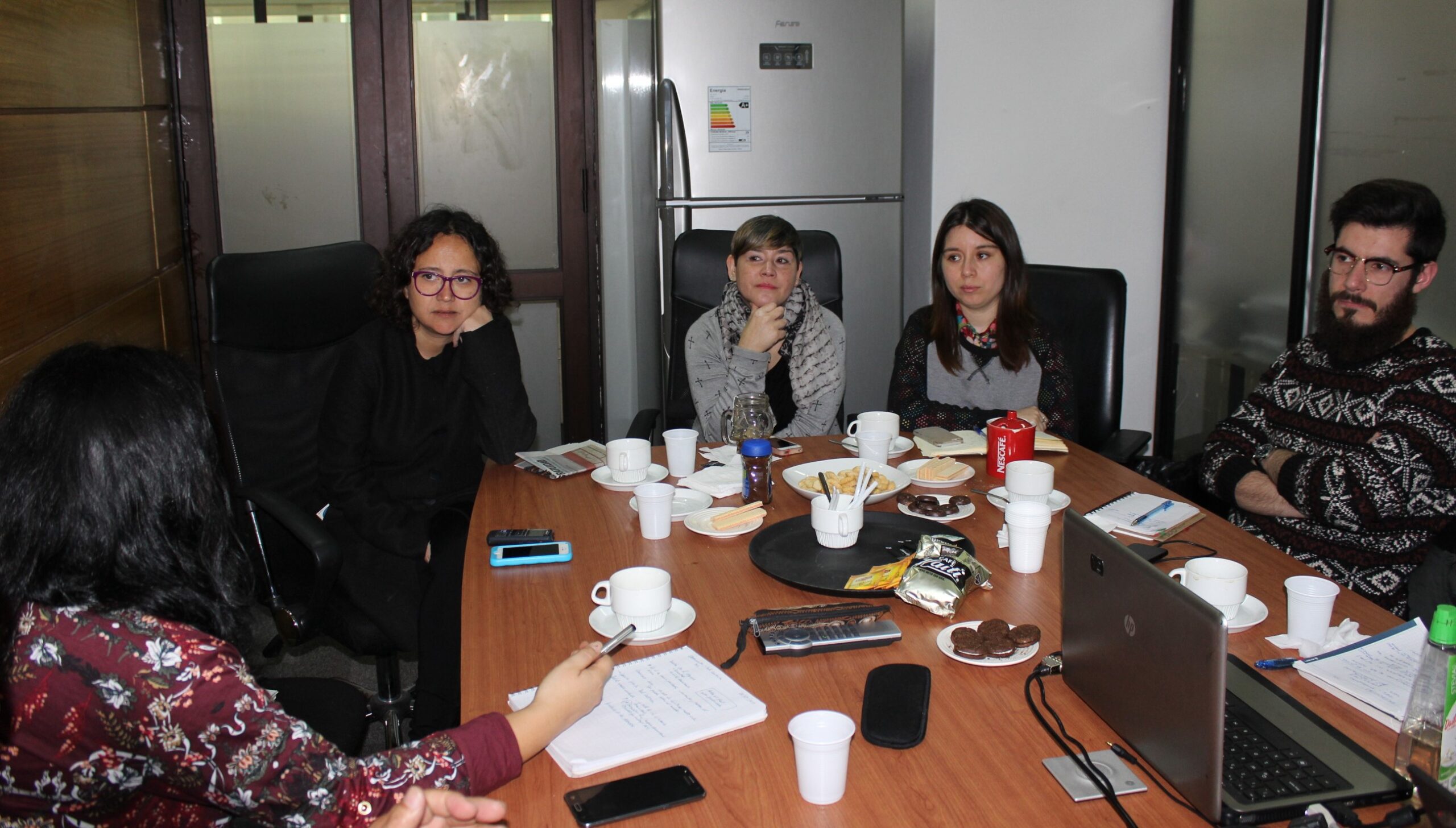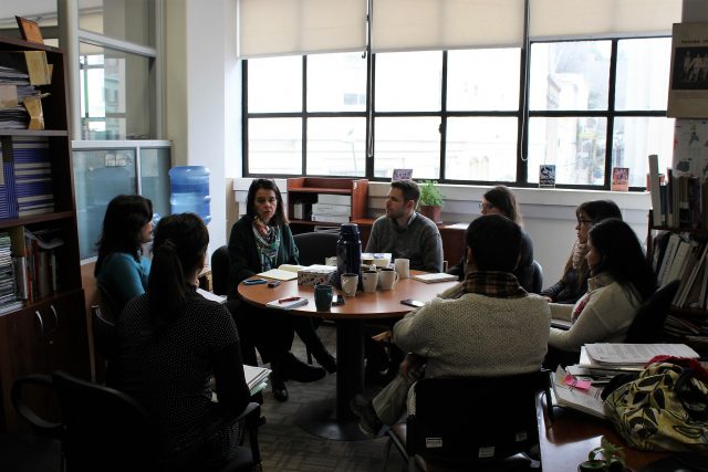 El encuentro con el equipo de la Región Metropolitana se compuso de dos partes: por la mañana, una conversación con el equipo de Red Cultura (Álvaro Rodríguez, Salvador Velásquez, Camila Garrido, Tomás Caroca, Vania Fernández); por la tarde, un encuentro con tres de las 17 OCC que fueron beneficiadas con el Fondo para Iniciativas Culturales de Base Comunitaria en Pro de la Integración Social en 2016 (Corporación Cultural La Feria/Escuela Artística Comunitaria, La Gandhí y La Escuela de Carnaval Raiz do Aukan).