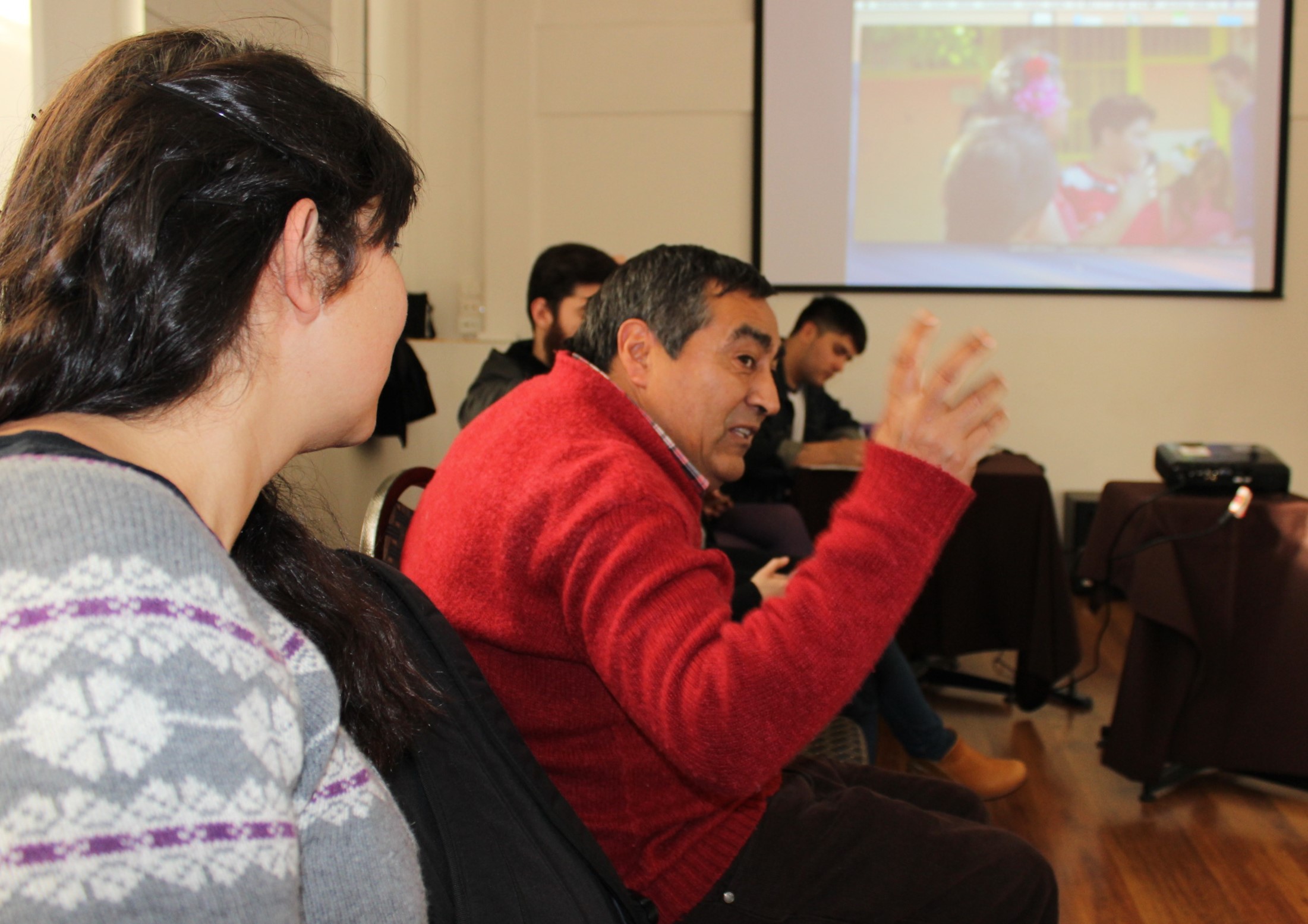 Por la tarde, la reunión fue con representantes de tres organizaciones culturales comunitarias de la Región Metropolitana que tenían fuerte vínculo con el tema del carnaval. Rosa Núñez, Hugo Melo y Carolina Arcos hablaron de sus quehaceres en La Escuela Artística Comunitaria, creada en 2012 en la comuna de Lo Espejo — un proyecto de la Corporación Cultural la Feria que empezó como una comparsa y pasó a una escuela gestionada por vecinos, donde se imparten talleres artísticos gratuitos a niños, jóvenes, adultos y adultos mayores de la región.