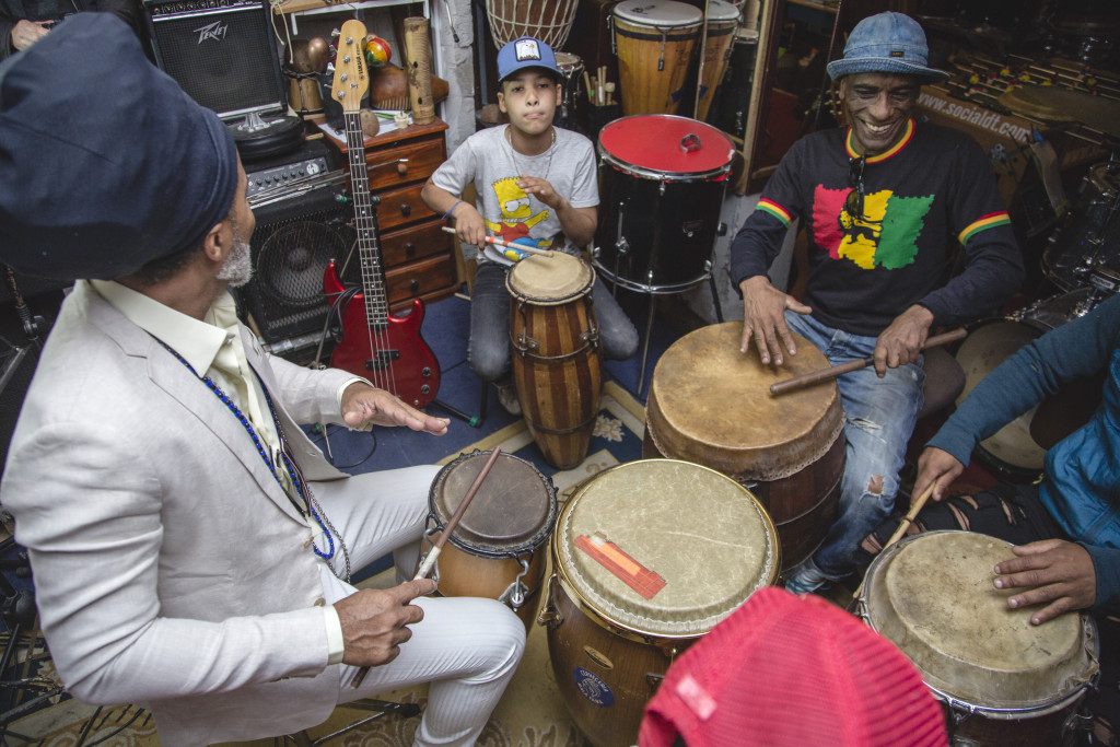 A conversa se deu na sala de ensaios, enquanto os dois improvisavam nos tambores, acompanhados do filho e dos netos do Lobo, e de convidados como o percussionista Santiago Comin, da organização argentina La Bombocova, uma das beneficiadas com os intercâmbios do edital IberEntrelaçando Experiências, lançado por IberCultura Viva. Também estavam presentes integrantes de dois Pontos de Cultura uruguaios selecionados no mesmo edital (Nación Zumbalelé e Colectivo Tierra Niegra), além de representantes do IberCultura Viva, da SEGIB e da Direção Nacional de Cultura do Ministério de Educação e Cultura do Uruguai. O cantor, compositor, percussionista e ator Rubén “El Negro” Rada chegou ao final da visita para cumprimentar o músico brasileiro. Foi recebido com festa.