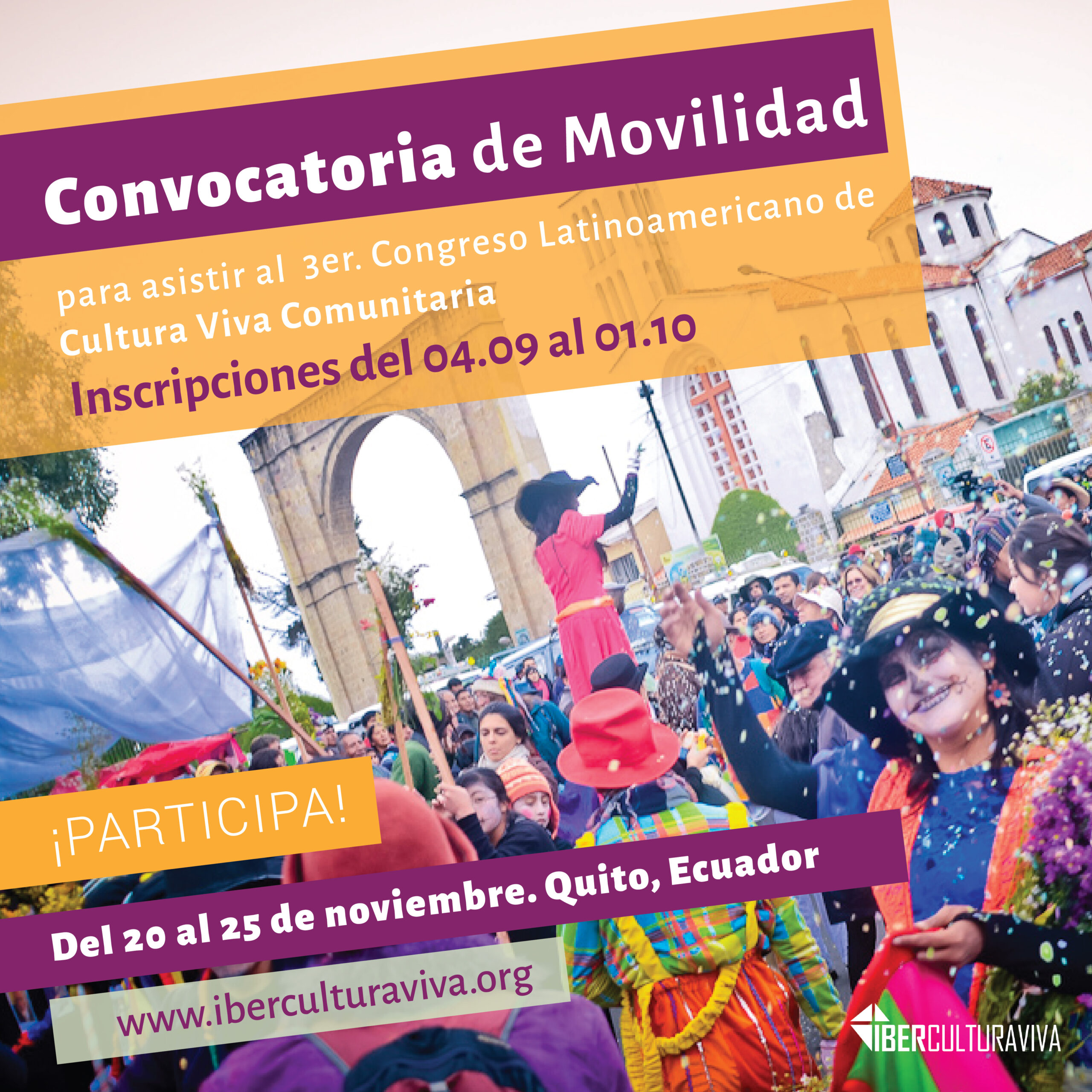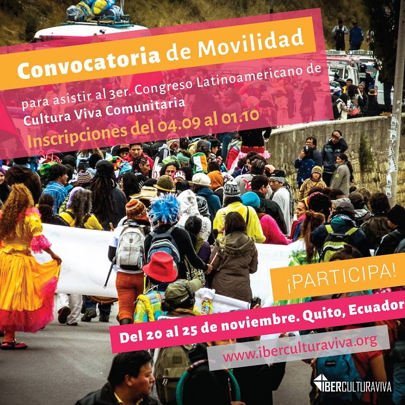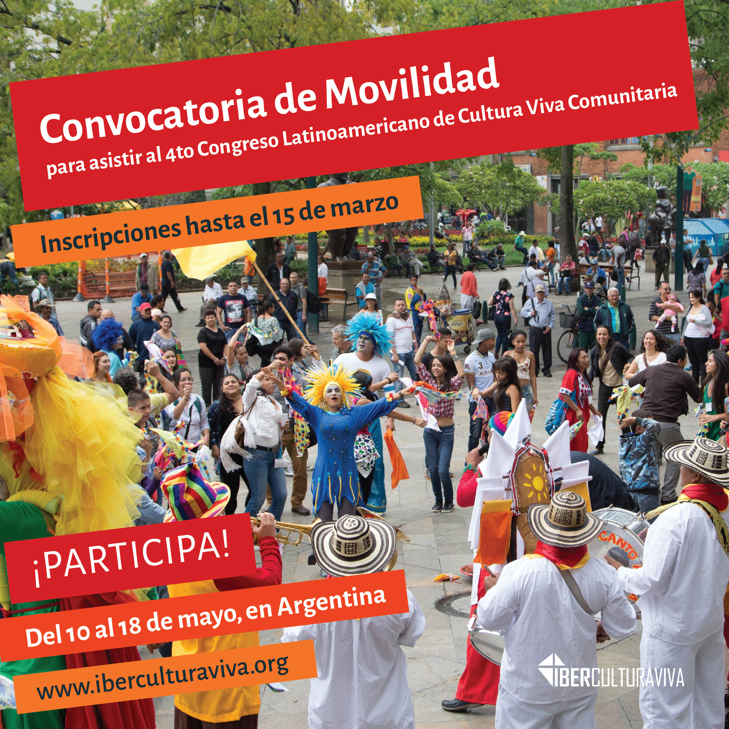 Las convocatorias de movilidad suelen apoyar la participación de representantes de organizaciones de la sociedad civil en los Congresos Latinoamericanos de Cultura Viva Comunitaria y sus reuniones preparatorias. Entre los criterios que se tienen en cuenta en la evaluación se encuentran la trayectoria de la organización en acciones culturales comunitarias, la experiencia en procesos de articulación de redes comunitarias, y el perfil de la persona candidata.