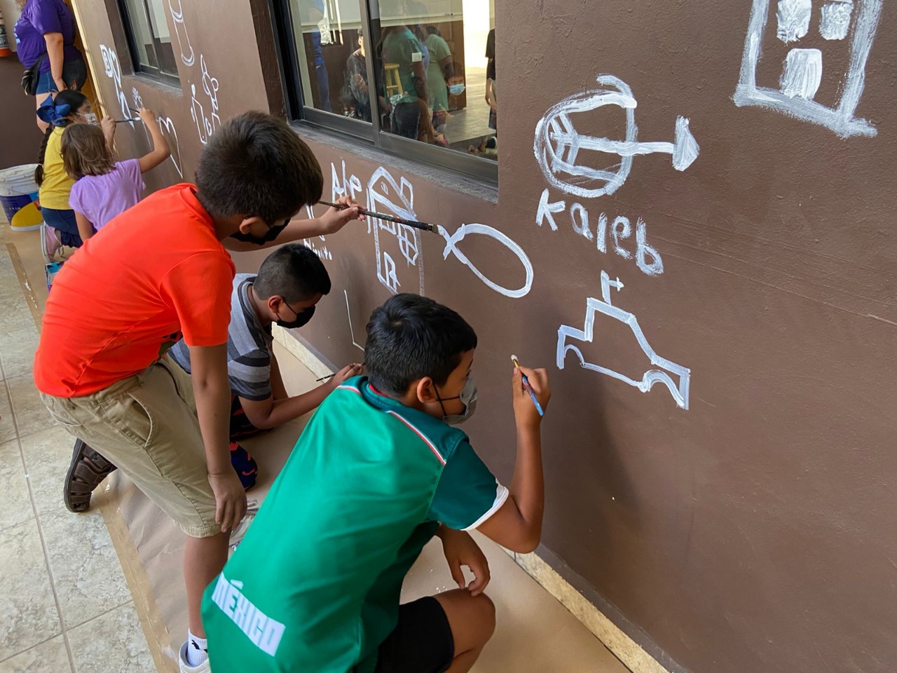 Los muralistas y gestores culturales comunitarios Roberto Jasso “Tigre”, Reynaldo Mata “Funky Gallo” e Imelda Cázares son los encargados de facilitar la pinta, a la que asistieron 44 niñas, niños y jóvenes de entre 3 y 18 años de edad.