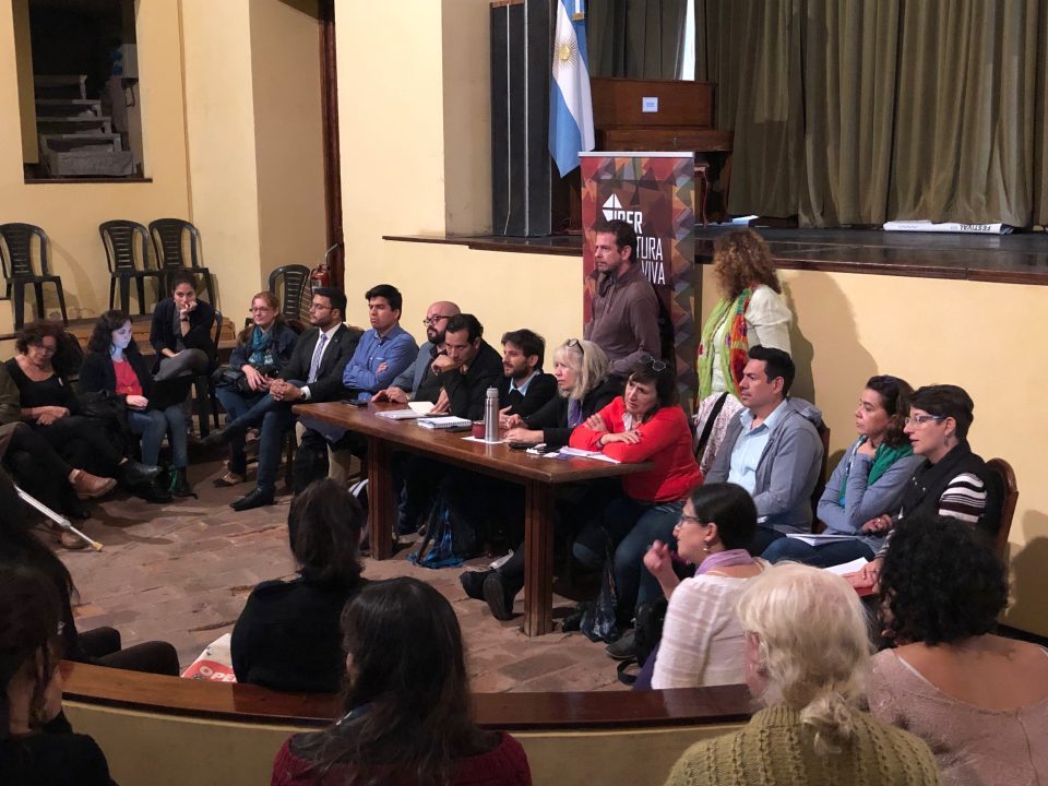 Alrededor de 80 personas estuvieron presentes en el Conversatorio sobre Políticas Culturales de Base Comunitaria y Cultura Viva Comunitaria, realizado el viernes 17 de mayo por la mañana en la Manzana de las Luces, en el centro de la ciudad de Buenos Aires (Argentina). El encuentro reunió representantes del Consejo Intergubernamental IberCultura Viva, representantes de gobiernos locales que participaban del 3º Encuentro de Redes, y representantes de organizaciones y colectivos que participaban en el 4º Congreso Latinoamericano de Cultura Viva Comunitaria.