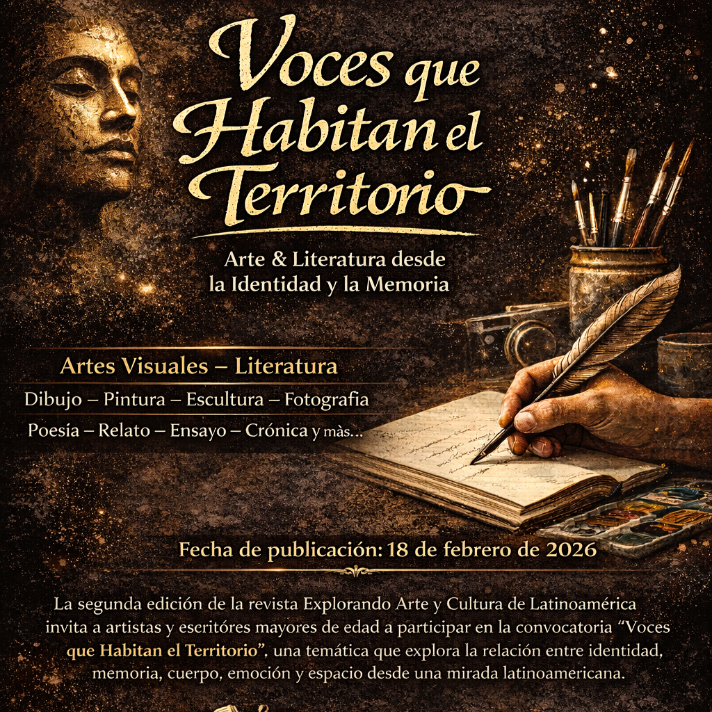 Convocatoria Abierta | Edición Internacional La revista Explorando Arte y Cultura de Latinoamérica invita a artistas y escritores mayores de edad a participar en su Convocatoria N.º 2: “Voces que Habitan el Territorio”. 8 enero – 8 febrero 2026 | Publicación: 18 febrero ISSN 3114-9871 🔗 https://convocatoria-n-2-voces-que-habitan-el.netlify.app/