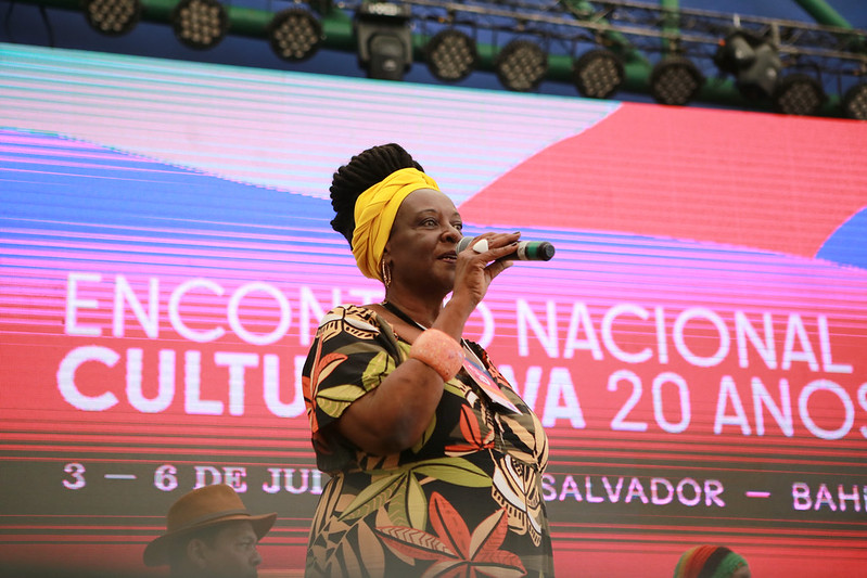 “Nesses 20 anos de Cultura Viva, o que mais a gente fez foi resistir. Se estamos aqui hoje, foi porque resistimos a todos os atropelos que tivemos que passar. Fizemos uma marcha para que a Lei Cultura Viva fosse implementada como Plano Nacional de Cultura Viva, e isso acontece agora. Se falo de oralidade e memória, a gente não pode esquecer desses momentos importantes. Não temos dinheiro para ir? Vamos a pé, de carona. mas vamos”, disse a mestre mineira, madrinha do Ponto de Cultura Moçambique Estrela Guia.