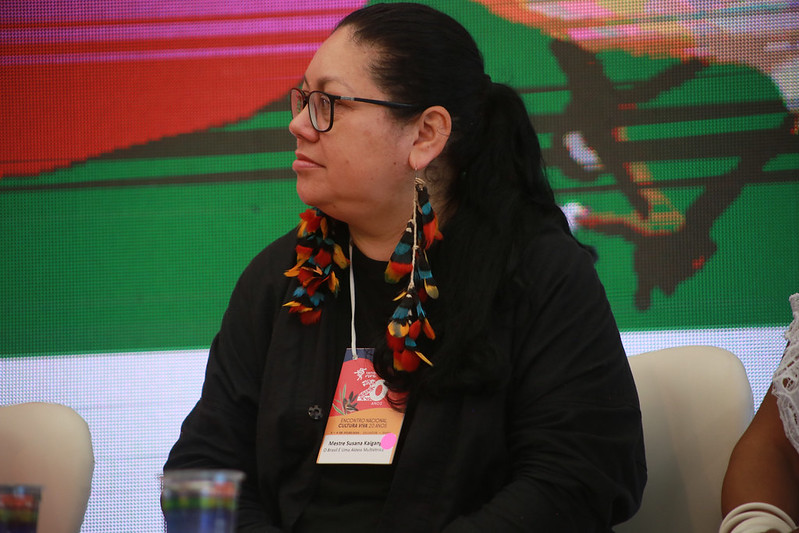Mestra Susana Kaingáng falou um pouco de seu povo, o terceiro maior povo indígena do Brasil (o país conta com 305 povos originários), e do Ponto de Cultura Kaingáng Jãre (significa “Raiz Kaingáng”), criado há 18 anos no município de Ronda Alta, no Rio Grande do Sul. Primeiro Ponto de Cultura situado em uma terra indígena a receber o reconhecimento do Ministério da Cultura, esta organização promove ações de valorização da cultura e conhecimentos tradicionais com os Kanhgág Kófa (ou anciãos Kaingáng), trabalhando em parceria com escolas e universidades.