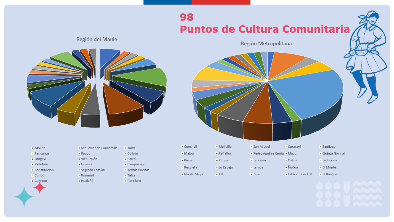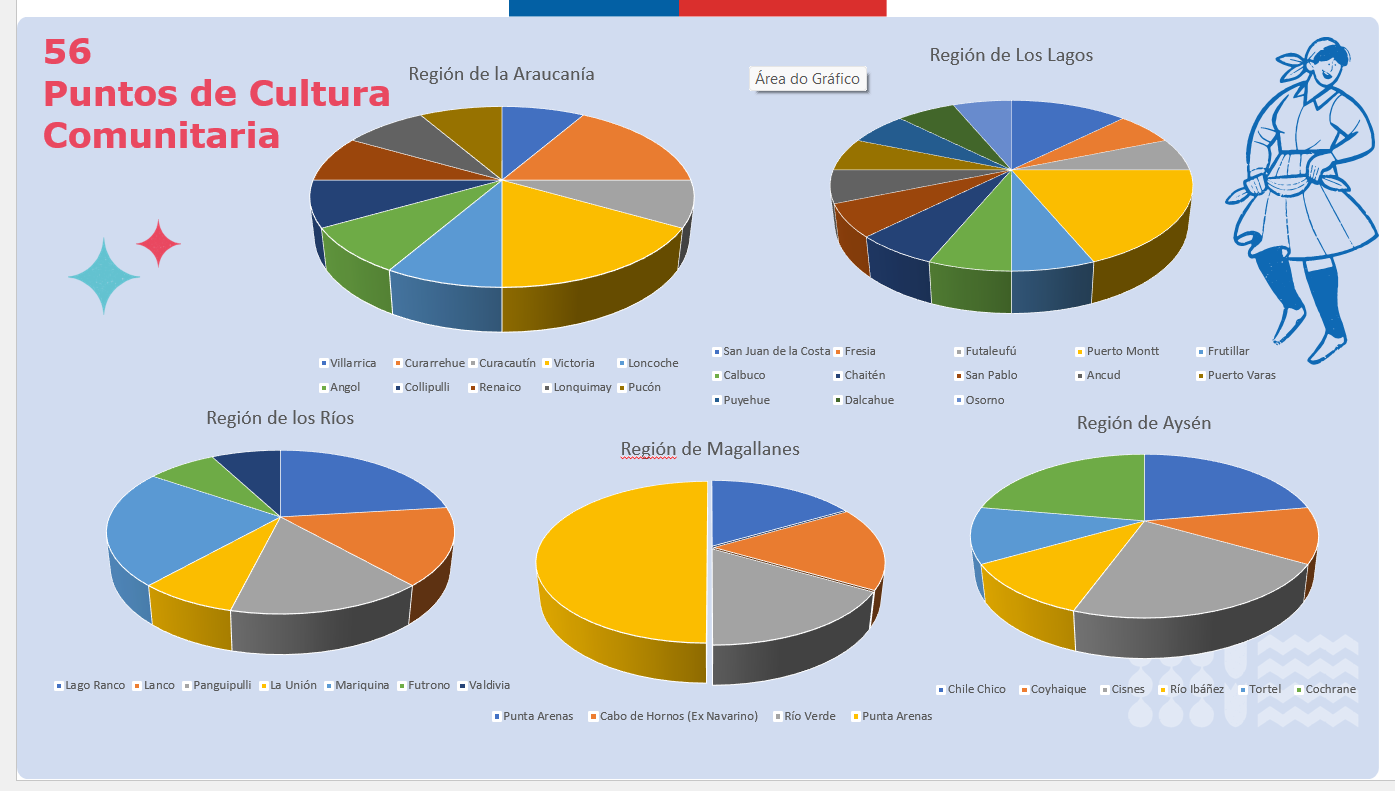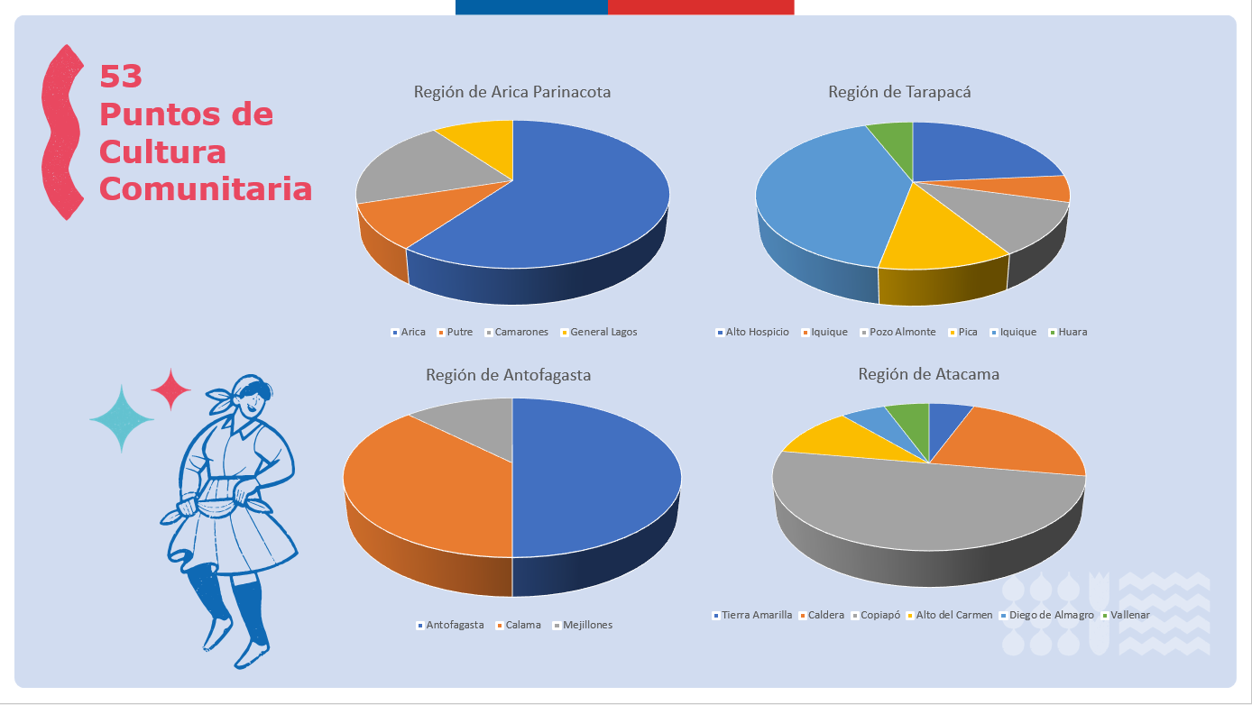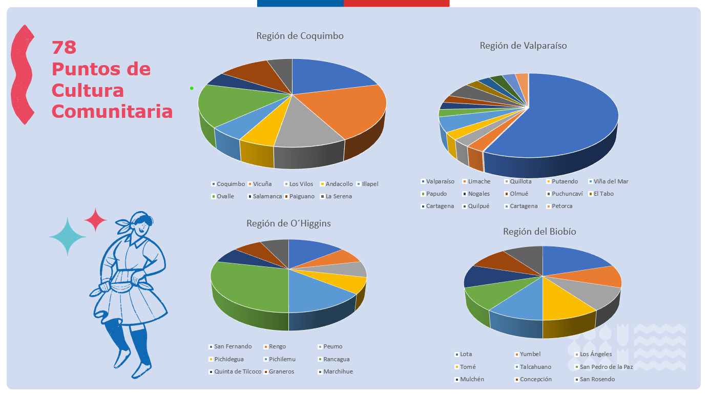 Ao fazer um detalhamento por região para mostrar como estão distribuídos os 285 Pontos de Cultura Comunitária validados, ela mencionou que a Região Metropolitana e a Região do Maule concentram a maioria dos PCCs (98) e que outros 78 estão distribuídos nas regiões de Coquimbo, Valparaíso, O’Higgins e Biobío. Nas regiões de La Araucanía, Los Lagos, Los Ríos, Magallanes e Aysén existem 56 Pontos, e nas regiões de Arica e Parinacota, Tarapacá, Antofagasta e Atacama, 53.