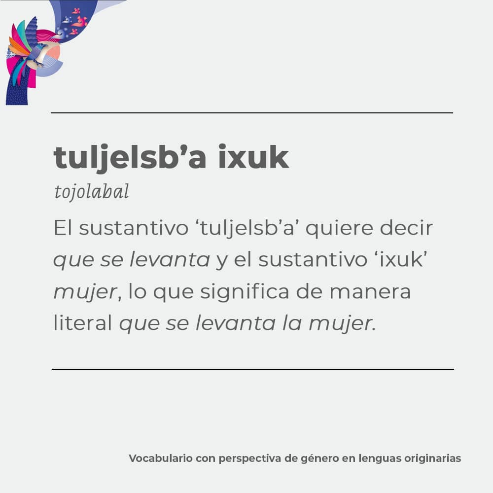 Vilma Guadalupe López Gómez, por sua vez, citou como exemplos dois conceitos – consciência de gênero e misoginia – e a forma como foram construídos em tojolabal. No primeiro caso, apontou o processo de criação do conceito, por meio do próprio léxico da língua. Conforme explicado durante o fórum virtual, o termo escolhido para ser entendido como “consciência de gênero” em tojolabal significa literalmente “estar consciente para que homens e mulheres vivam bem”. Para a palavra “misoginia”, foi feita uma composição que literalmente significa “ódio às mulheres”.