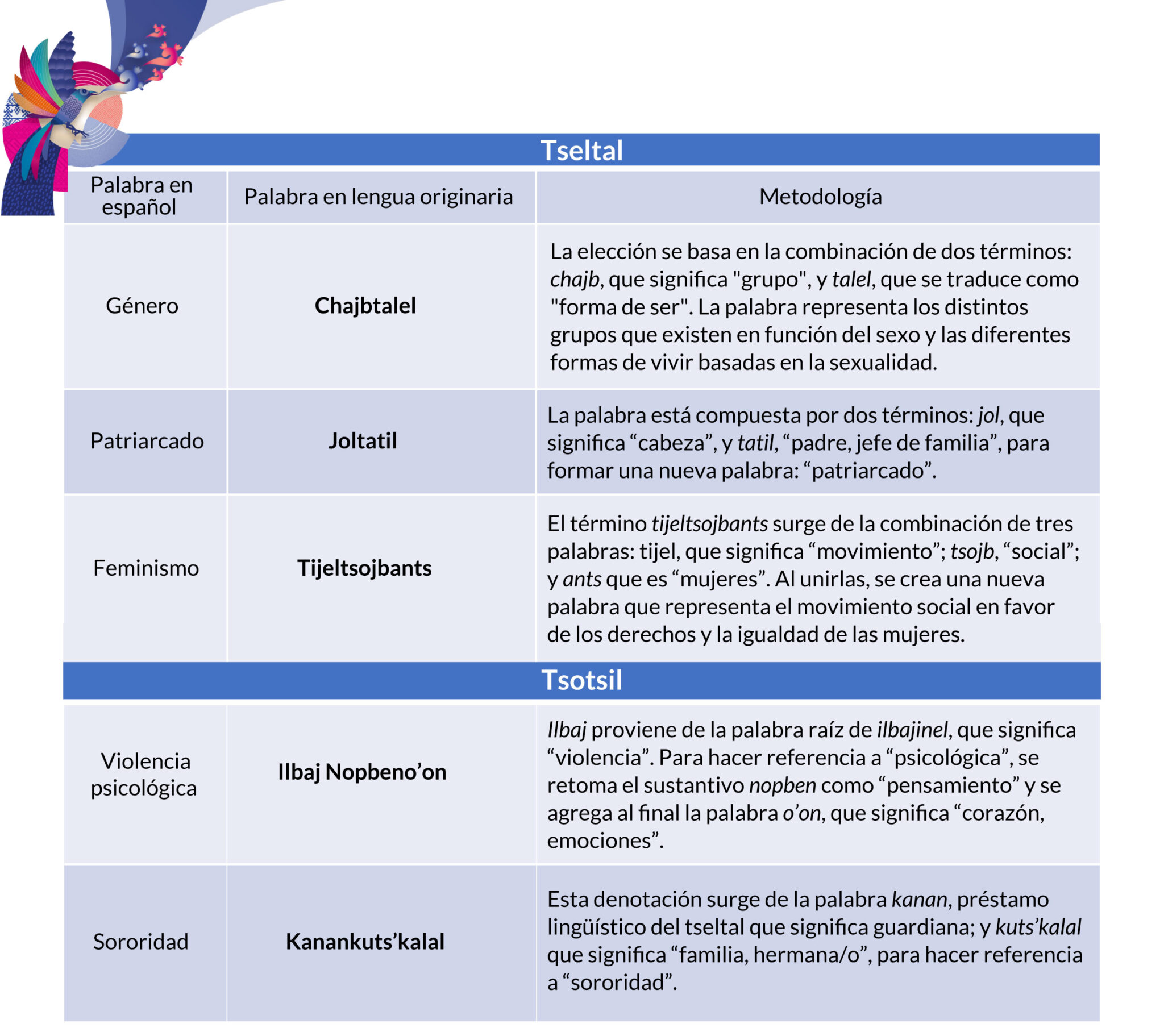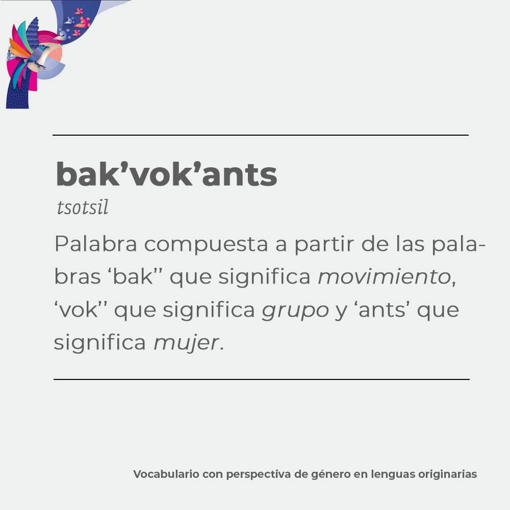Depois de utilizar muitos termos em espanhol, por falta de outros em tsotsil (sua língua materna), Bertha Lorena percebeu que isso acontecia nas três línguas, e que colegas de trabalho também faziam empréstimos linguísticos, o que dificultava a compreensão da disciplina e diminuía o uso da língua originária. Foi por isso que começou a ser desenvolvido um vocabulário com perspectiva de género, incluindo palavras e termos como violência psicológica, autonomia, disparidades de género, empatia, equidade, assédio sexual, feminicídio, assédio, abuso sexual, sexting e misoginia, entre outros. .